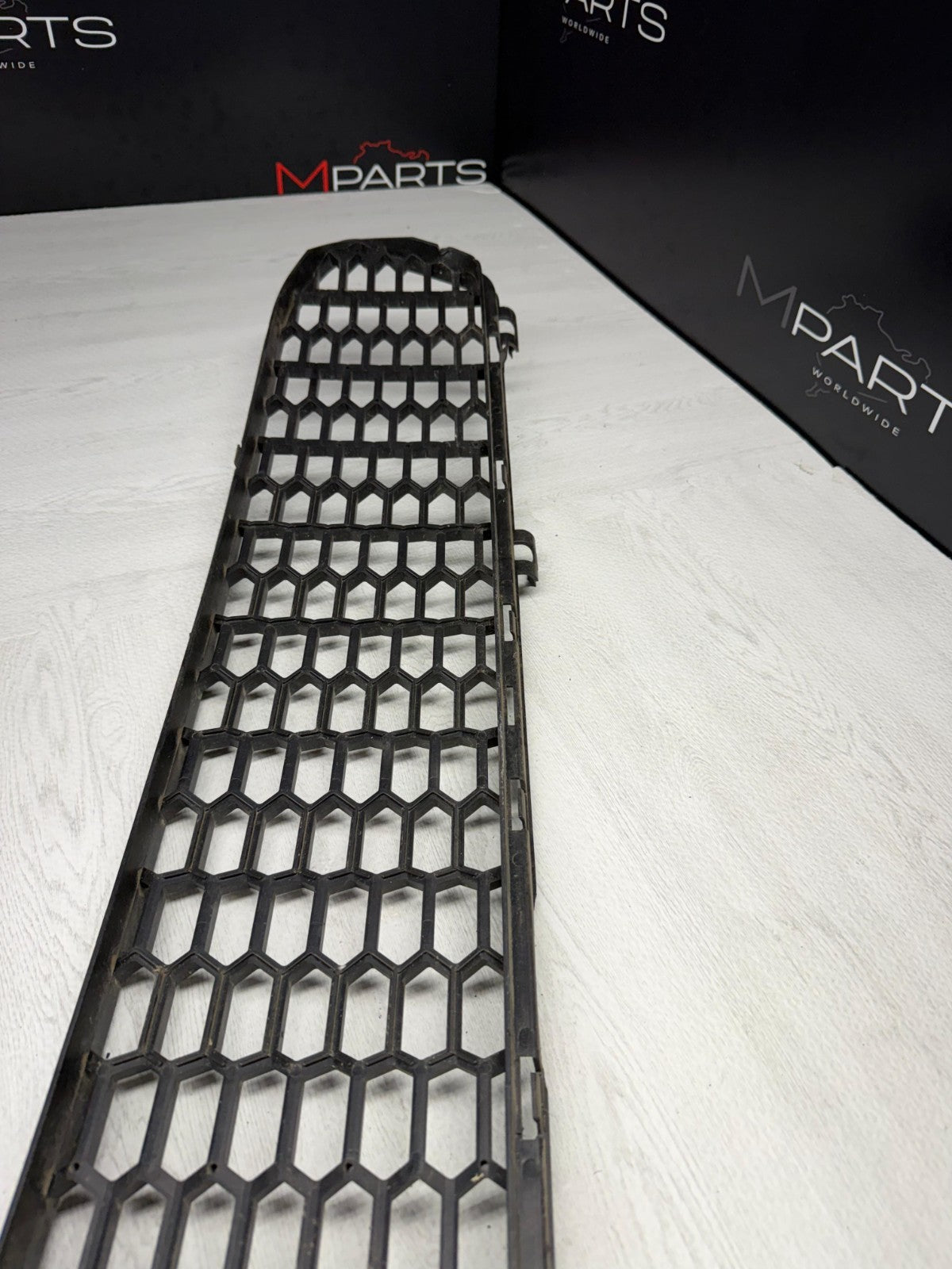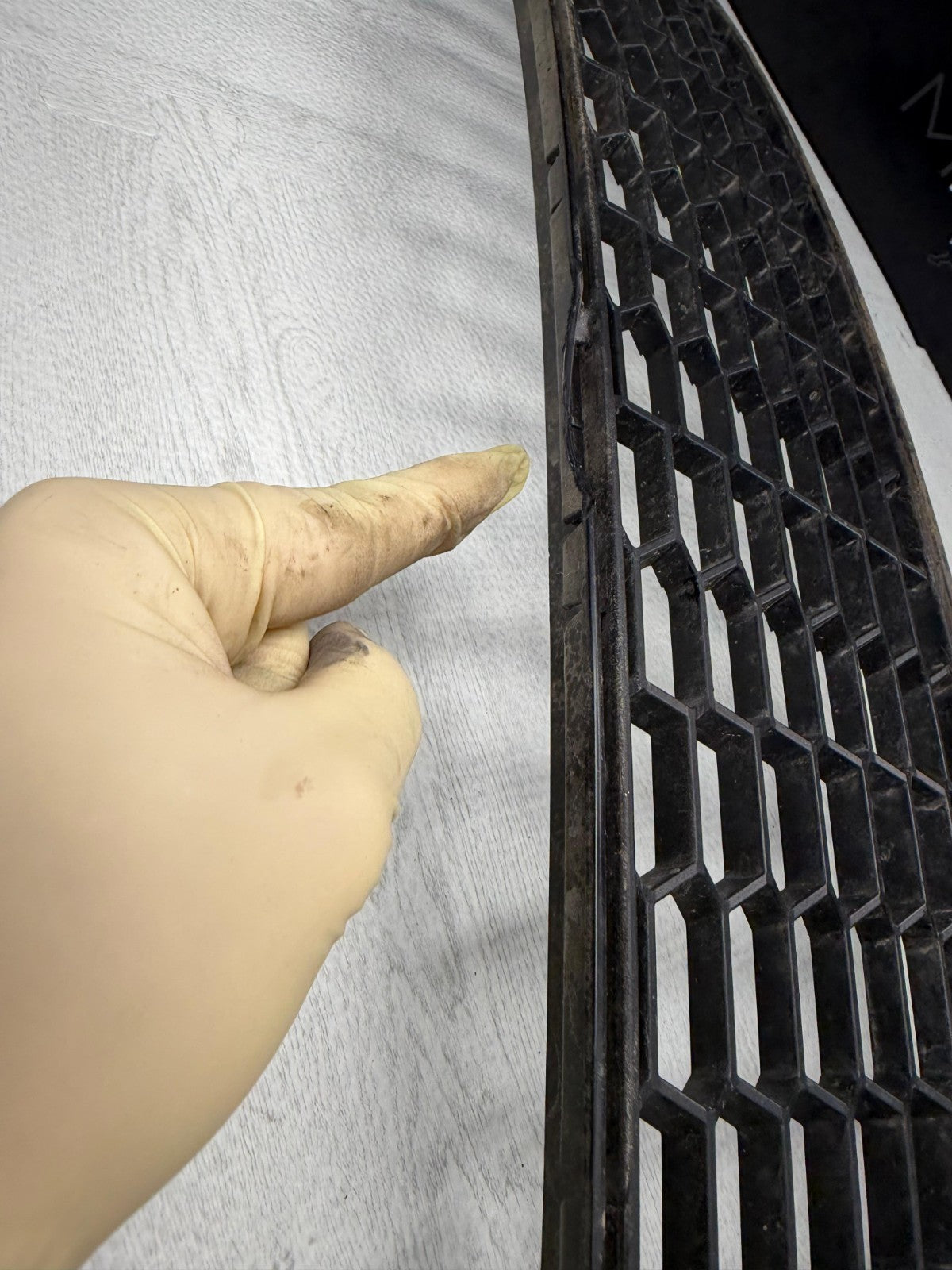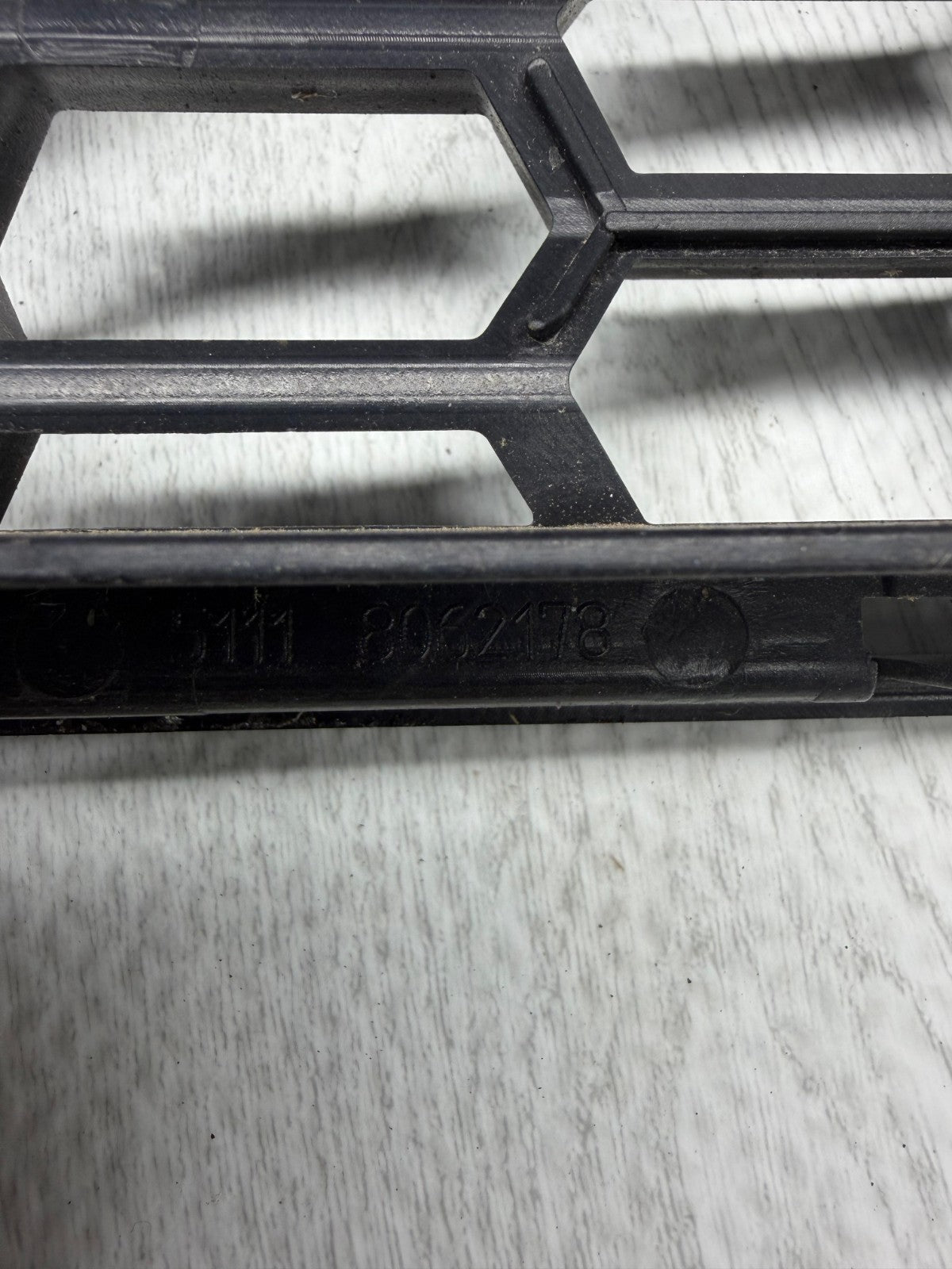 15-18 BMW F87 M2 FRONT BUMPER CENTER GRILLE OEM 51118062178 8062178 *NOTESNotes: Finger is highlighting a visible break or crack in the outer plastic frame of the black honeycomb-style grille.**